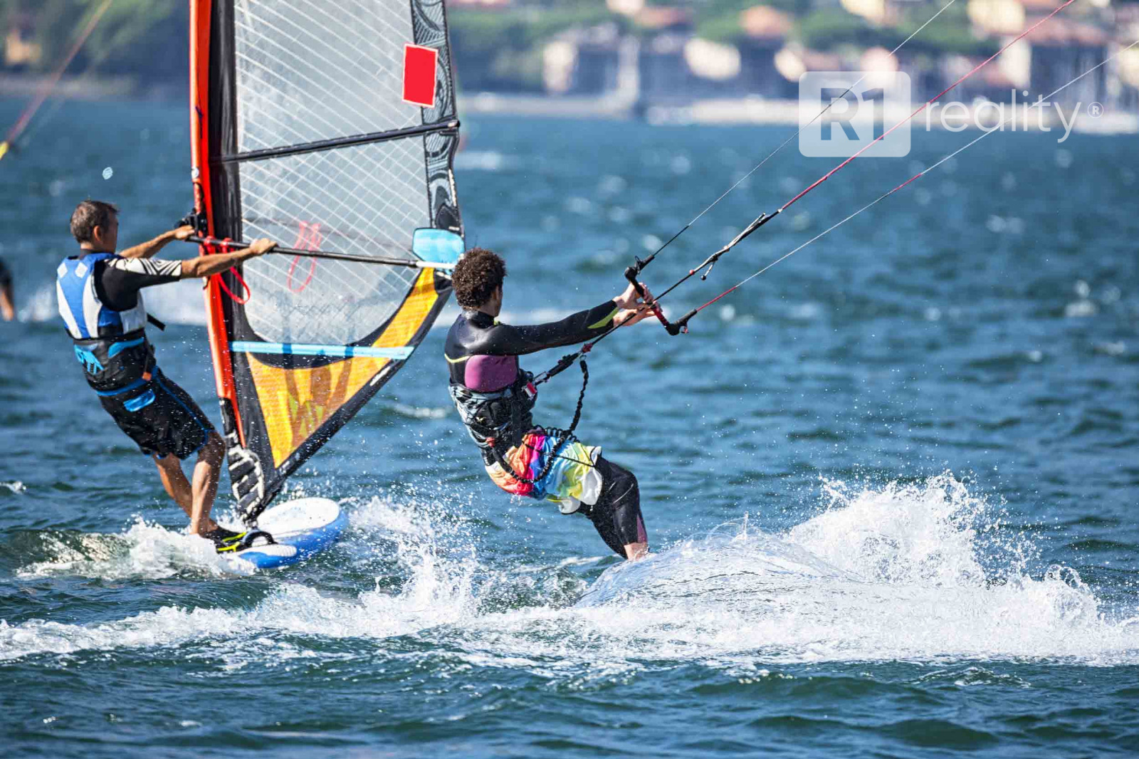 Create a photorealistic image of people enjoying water sports or outdoor activities near the beach, with apartments subtly visible in the background. Create a sense of adventure and fun